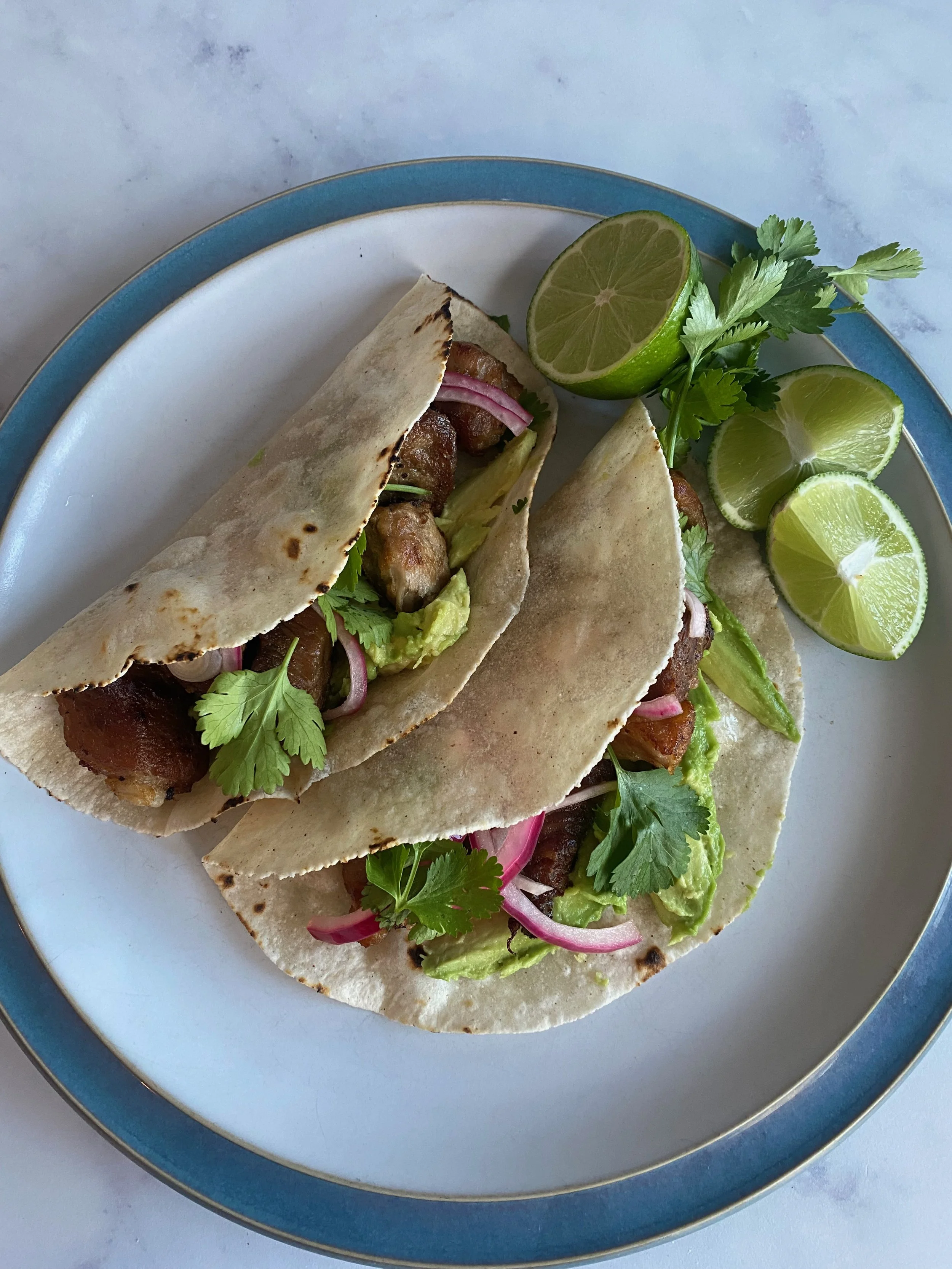 Fill with your favorite taco toppings. I used ripe avocado, cilantro and fresh lime juice. Feel free to add salsa, hot sauce, fajita veggies… its all good!